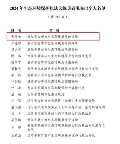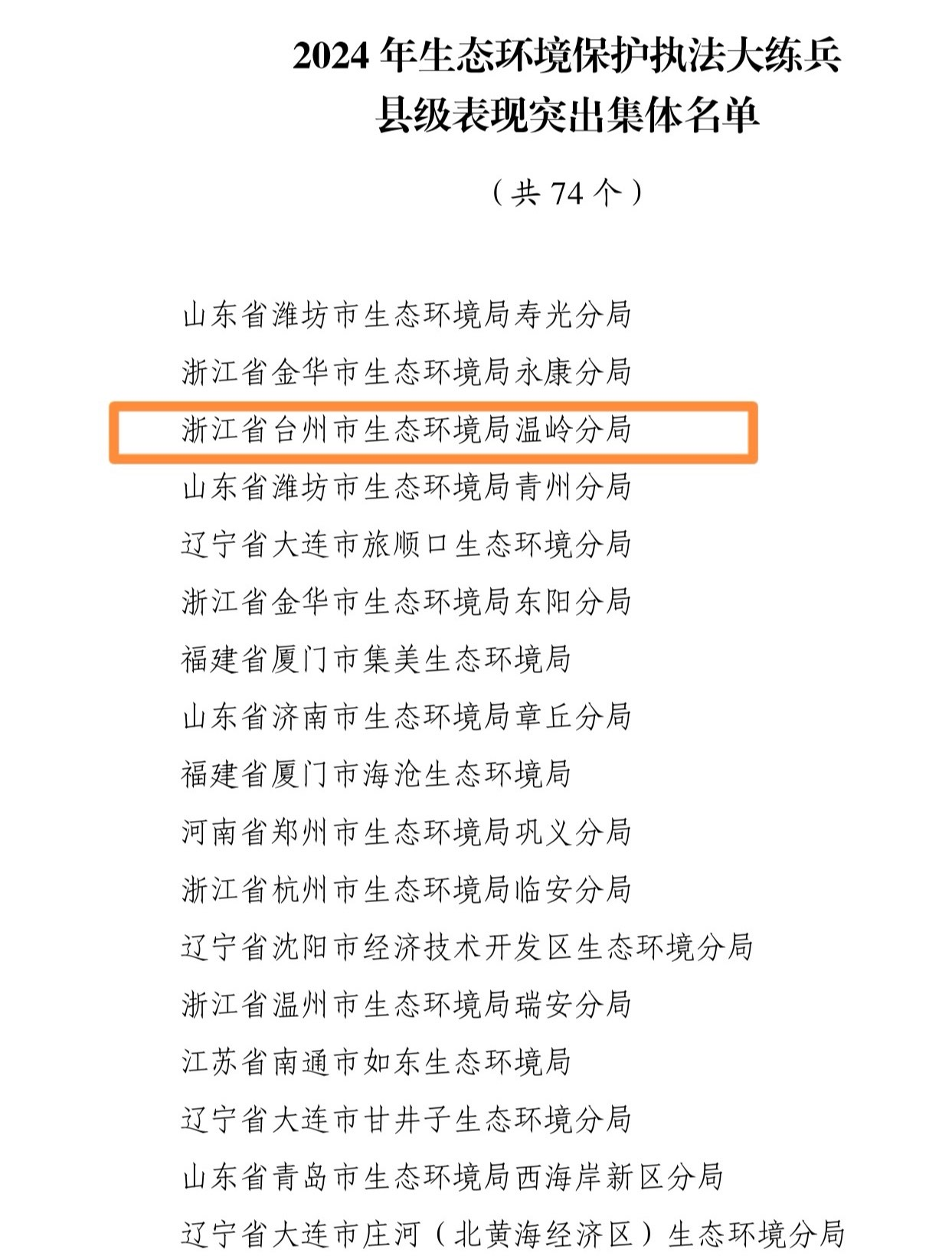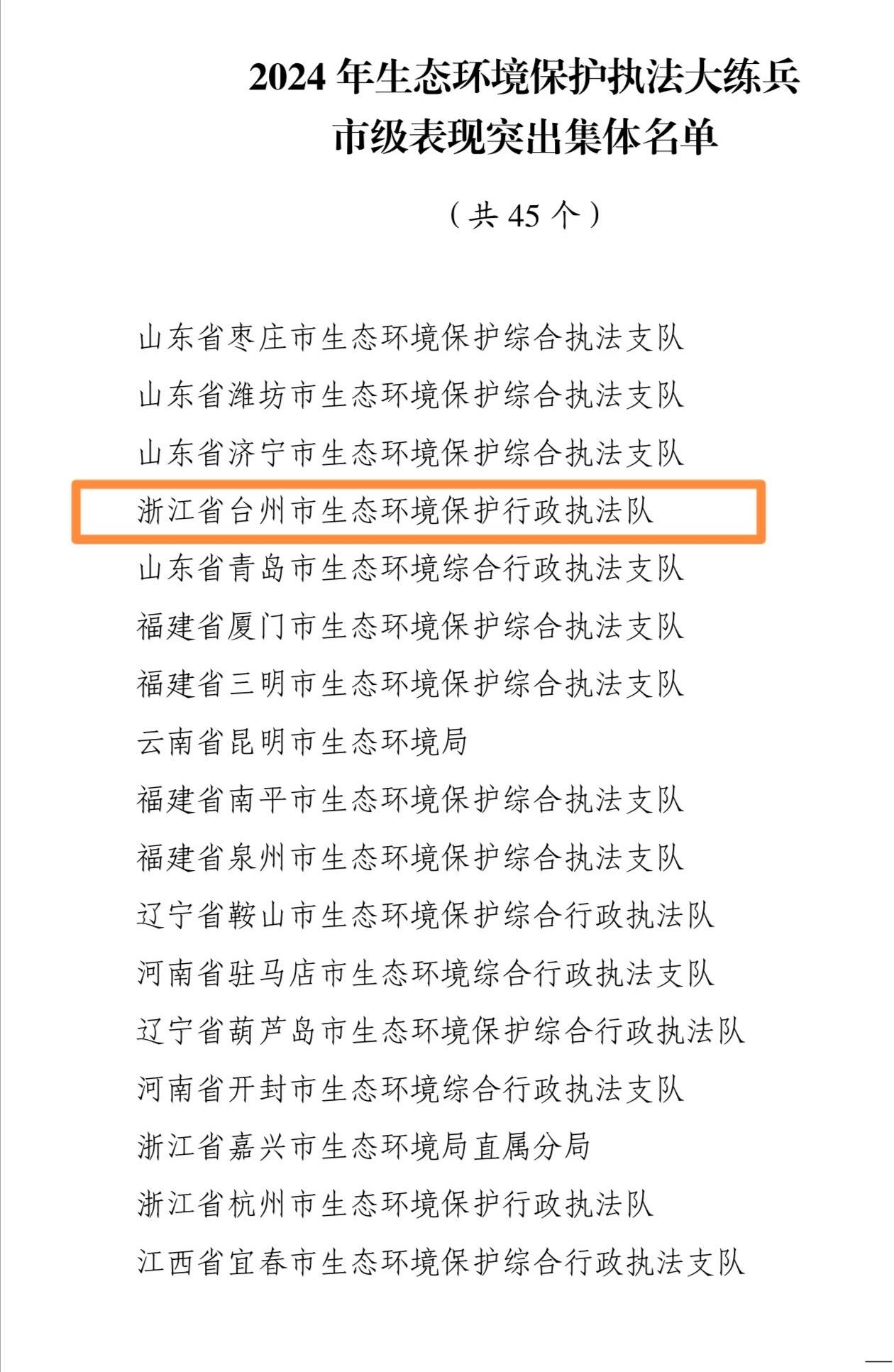 近日,生態(tài)環(huán)境部正式通報表彰了2024年全國生態(tài)環(huán)境保護(hù)執(zhí)法大練兵突出集體和個人名單,臺州市生態(tài)環(huán)境保護(hù)執(zhí)法工作再獲殊榮:市生態(tài)環(huán)境保護(hù)行政執(zhí)法隊和市生態(tài)環(huán)境局溫嶺分局被評為表現(xiàn)突出集體,均連續(xù)三年蟬聯(lián)此項國家級榮譽(yù)。市生態(tài)環(huán)境保護(hù)行政執(zhí)法隊連續(xù)兩年蟬聯(lián)全國第一,連續(xù)三年全省第一。